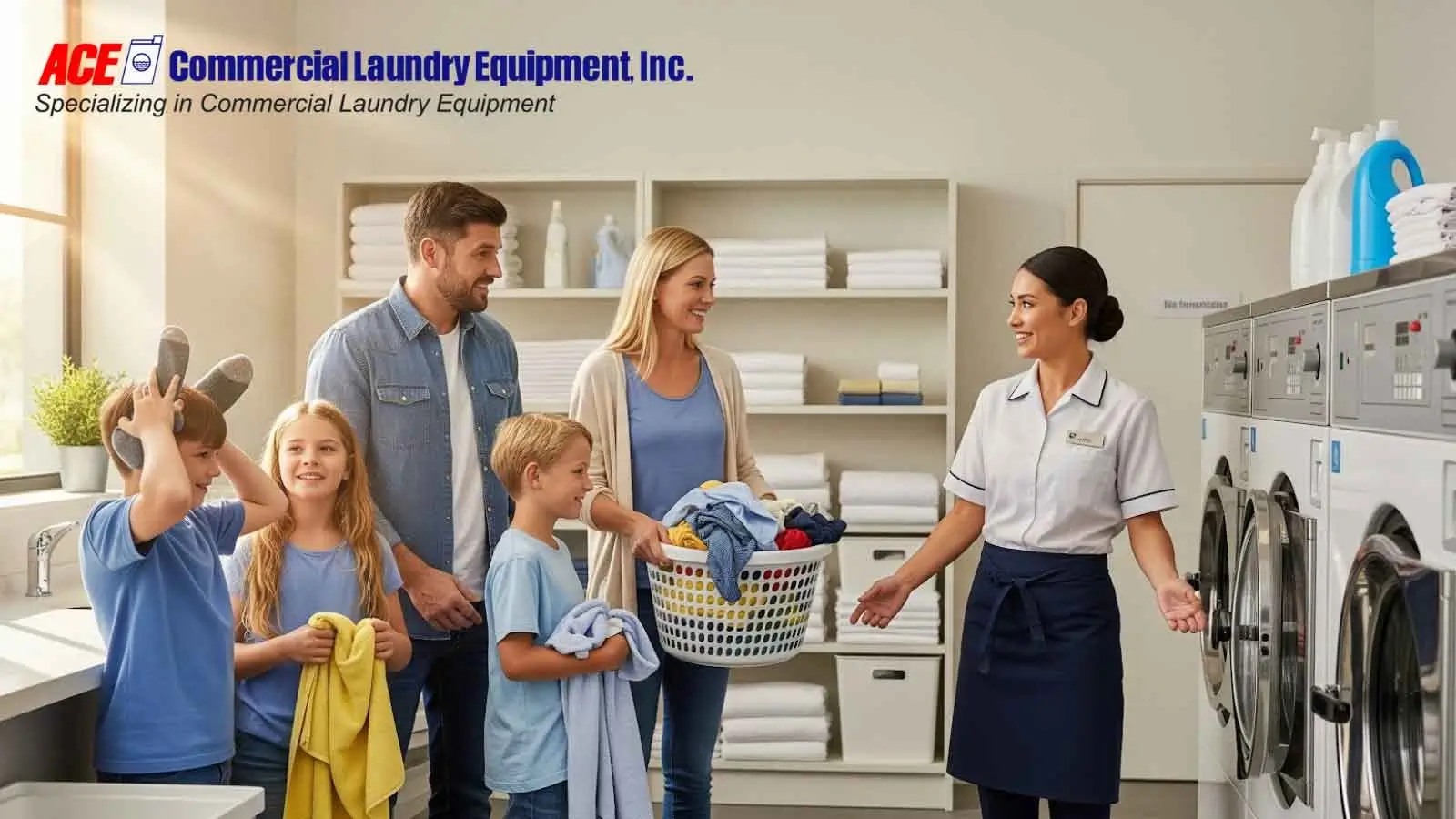A smiling family with children bringing laundry to a laundromat, guided by a staff member near commercial washing machines.